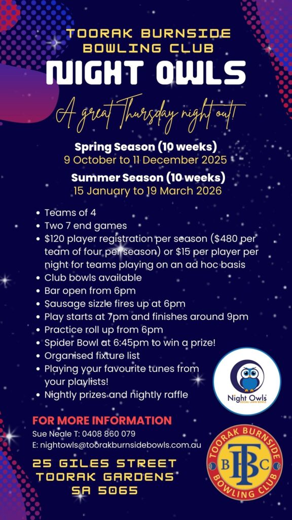 Night Owls is a social bowls competition held on Thursday nights from October to March. It’s all about enjoying the game in a relaxed and fun environment.
